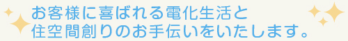 当社は、地域で生まれ育った、地域の電気専門店として「家まるごと」をテーマとし、電化製品を初めシステムキッチンやトイレ等の水周りから床暖房、照明器具などお客様の生活スタイルや家族構成等にあわせたご提案をさせて頂きます。ぜひ一度お尋ね下さい。